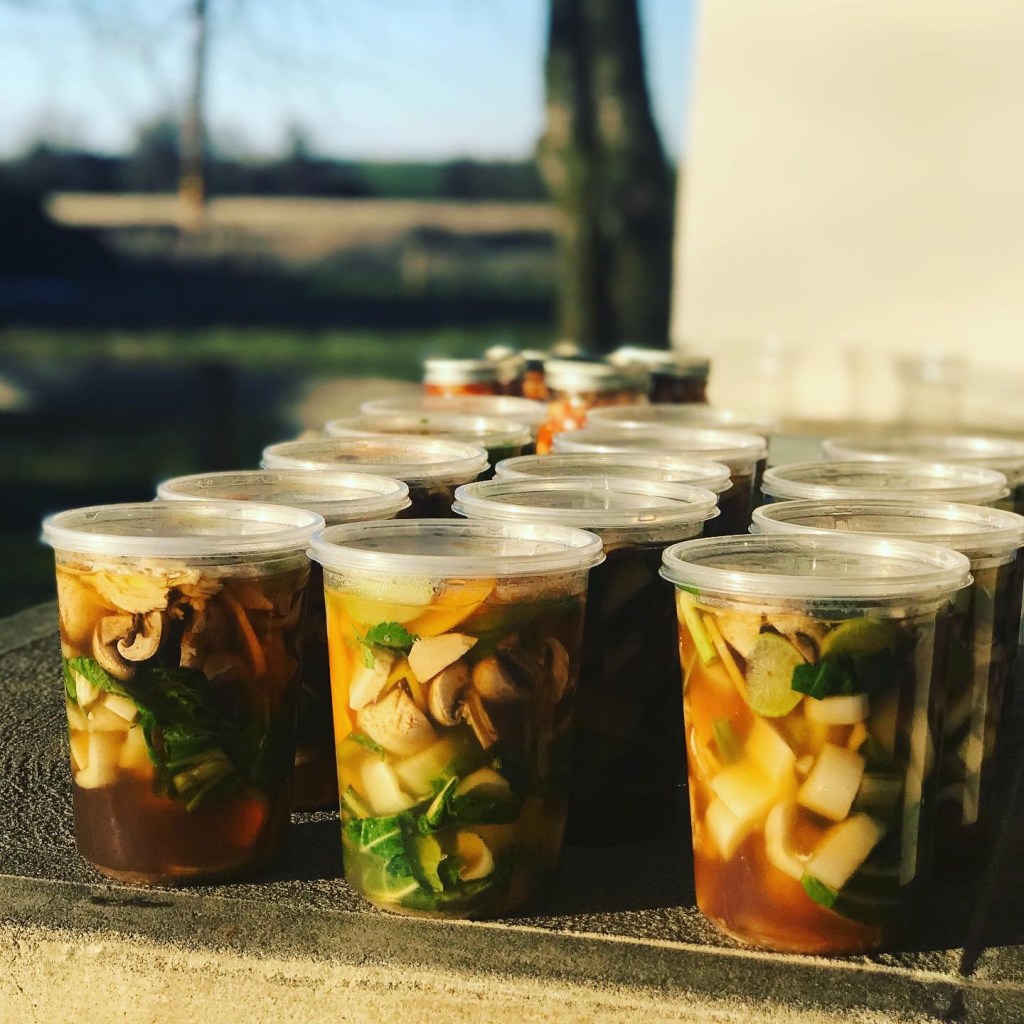 Then, you build your soup. Are you adding some soaked dried beans to the simmer ? Prepare your vegetables or pre-cook your meats. Slice or pull your vegetables and proteins. Then you can take this gorgeous broth and pour it over your storage containers of prepared fillings.