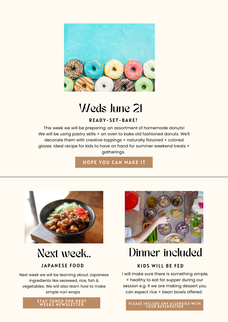 In June 2023 I launched a SUMMER COOKERY CLUB kids and teens. COOK CLUB is held seasonally in a host home with a roomy kitchen. Each series targets a different group of kids or teens by neighborhood & social network. The ideal group size is about 6-9 kids aged 6-12 or tweens and teens aged 10+.